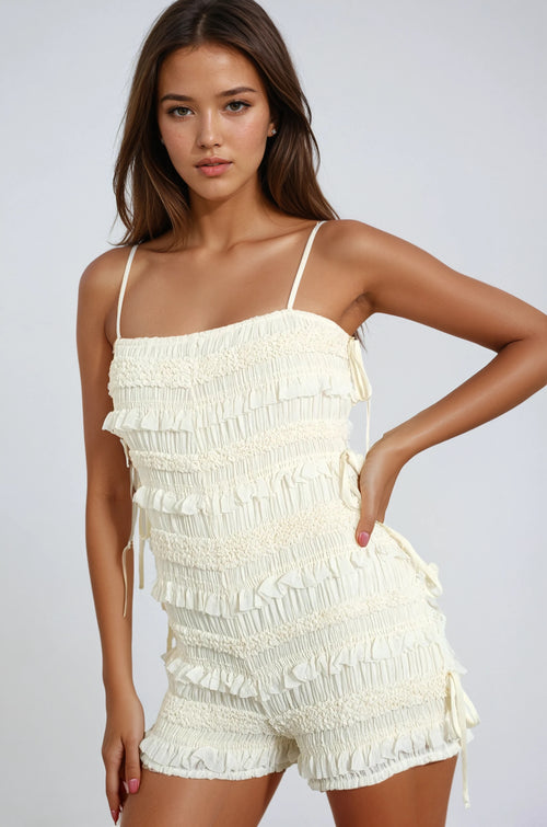 Rule your world, softly, in the Carefree Reign Smocked Romper. This one-piece features a soft textured knit fabric with all-over smocking for a flattering fit. Designed with adjustable spaghetti straps, self-ties at the sides, and a fully lined interior for comfort and confidence. Effortlessly stylish, this romper is your go-to for warm days and carefree moments.