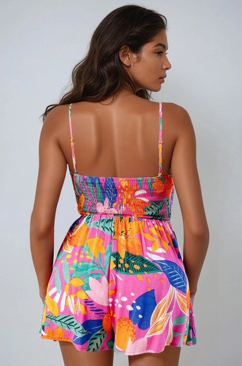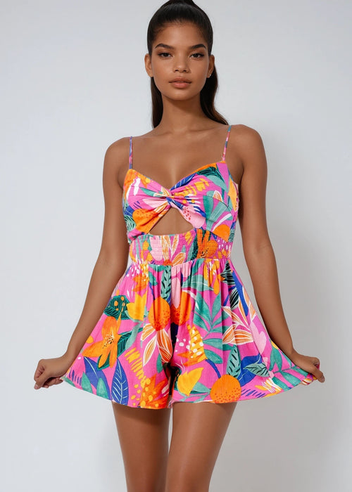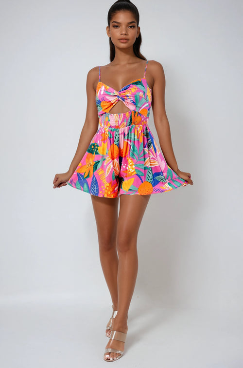 Flirt with the sun. Dance with the breeze. The Tropic Tease Cutout Romper is made for sun-drenched getaways and breezy afternoons. With a bold tropical print, sweetheart neckline, and playful cutout front, this one-piece delivers feel-good style with effortless flair. Just add sandals, hoops, and a messy bun—ready for the beach or the boardwalk. Fabric: Self: 100% Rayon | Lining: 100% Polyester.