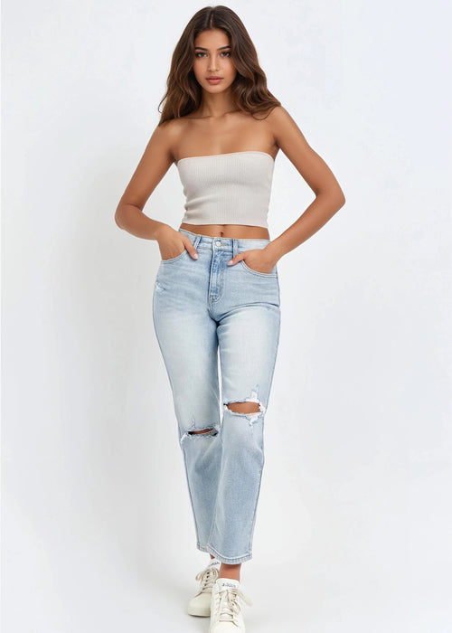 Boundless Blue High Rise Denim — freedom stitched in every line. Designed for the girl who moves with confidence and ease, these high-rise jeans offer a flattering straight-leg fit that’s roomy through the hip and thigh. The light blue wash and knee distressing add that perfect worn-in touch, blending laid-back energy with timeless style. Fabric: 99% Cotton, 1% Spandex.   Made from a soft, breathable cotton blend, these jeans stretch just enough to keep up with your every move—whether you’re exploring the city, catching flights, or chasing dreams.