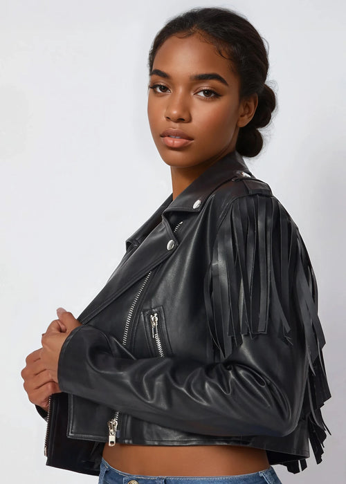 Dream Rider Cropped Fringe Jacket — for the girl who chases freedom and wears confidence like armor. This cropped faux leather fringe jacket radiates fearless energy and effortless edge, designed for women who turn every moment into a movement.   Featuring bold fringe details along the shoulders and back, a notched collar, and a sleek zip-front closure, this jacket combines vintage Western vibes with modern street-chic flair. Side pockets and long sleeves complete the look, making it as functional as it is iconic.   Pair it with denim, dresses, or boots — because every dream deserves to be lived boldly, one ride at a time.   Details: Fabric: Shell – 50% Polyurethane, 50% Cotton; Lining – 100% Polyester Fringe detail at shoulders and back Notched collar, zipper front closure, side pockets Model is 5'7" and wears size Small