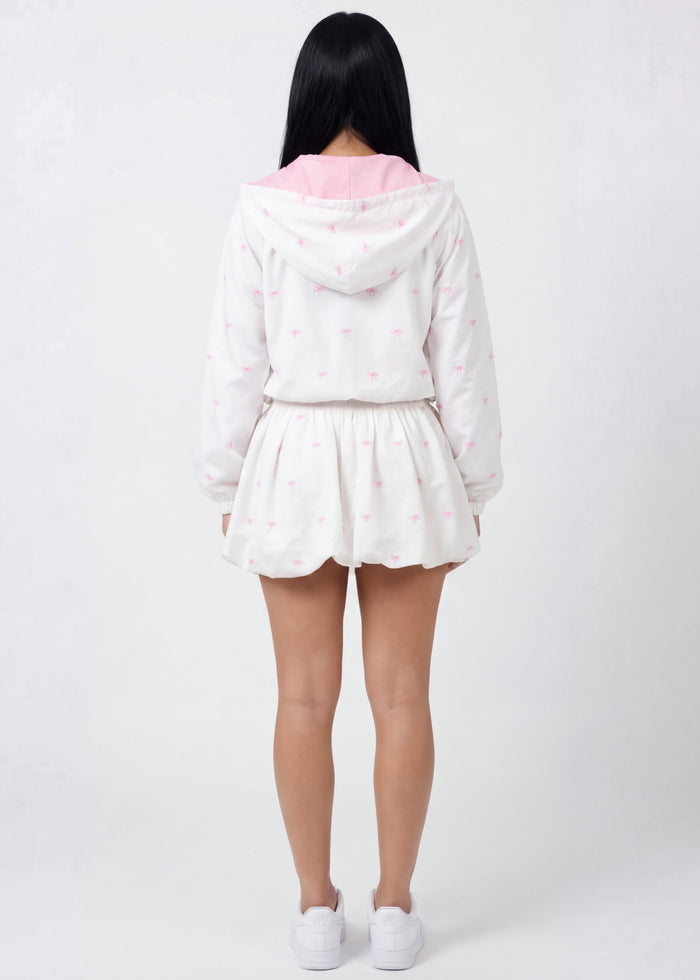 Step boldly into your moment with the Heart of Courage Windbreaker Hoodie & Mini Skort Set, designed for those who lead with passion and unapologetic style. This look pairs a cropped windbreaker jacket with a ruffled hoodie and delicate coquette ribbon bow print, matched perfectly with a bubble hem mini skort. Made from 100% polyester, it balances softness and structure—ideal for expressing confidence, individuality, and movement. Whether you’re out with friends, heading to an event, or simply embracing your day, this set reminds you to trust your voice, take up space, and move fearlessly forward.