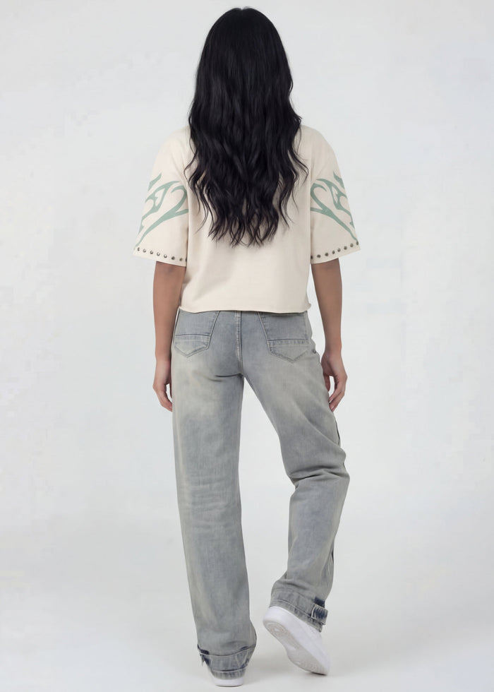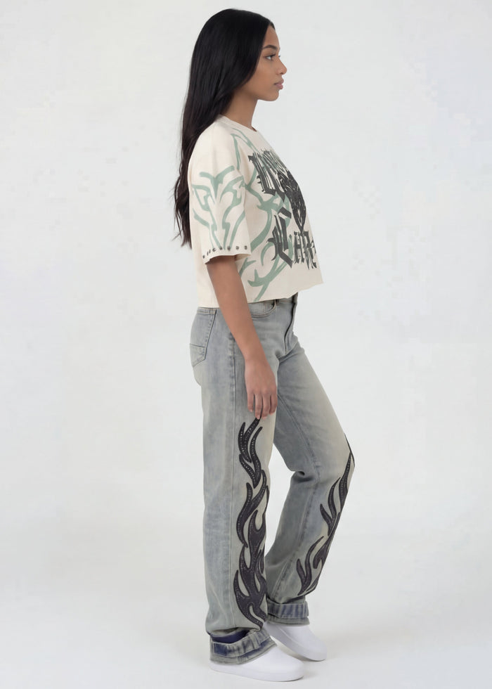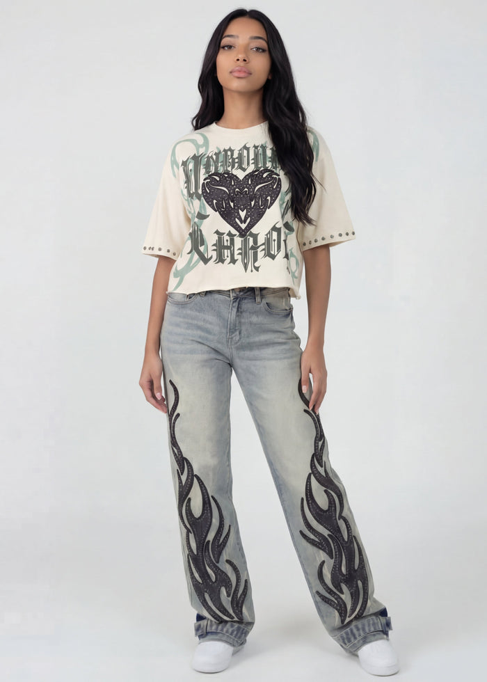 Your story. Your script. The Sacred Script Denim Jeans transform belief into fashion that feels authentic and powerful. The women’s boxy fit french terry knit crop tee features an oversized silhouette that radiates comfort and confidence—a visual affirmation of self-worth (not included). Paired with mid-rise, wide-leg denim crafted from a 98% cotton and 2% spandex blend, the set combines structure and stretch for a flawless fit. Patched accents add depth and texture, giving the jeans a modern, worn‑in charm with fashion‑forward attitude. Together, they create a look that is effortlessly expressive—soft, fearless, and unapologetically you.