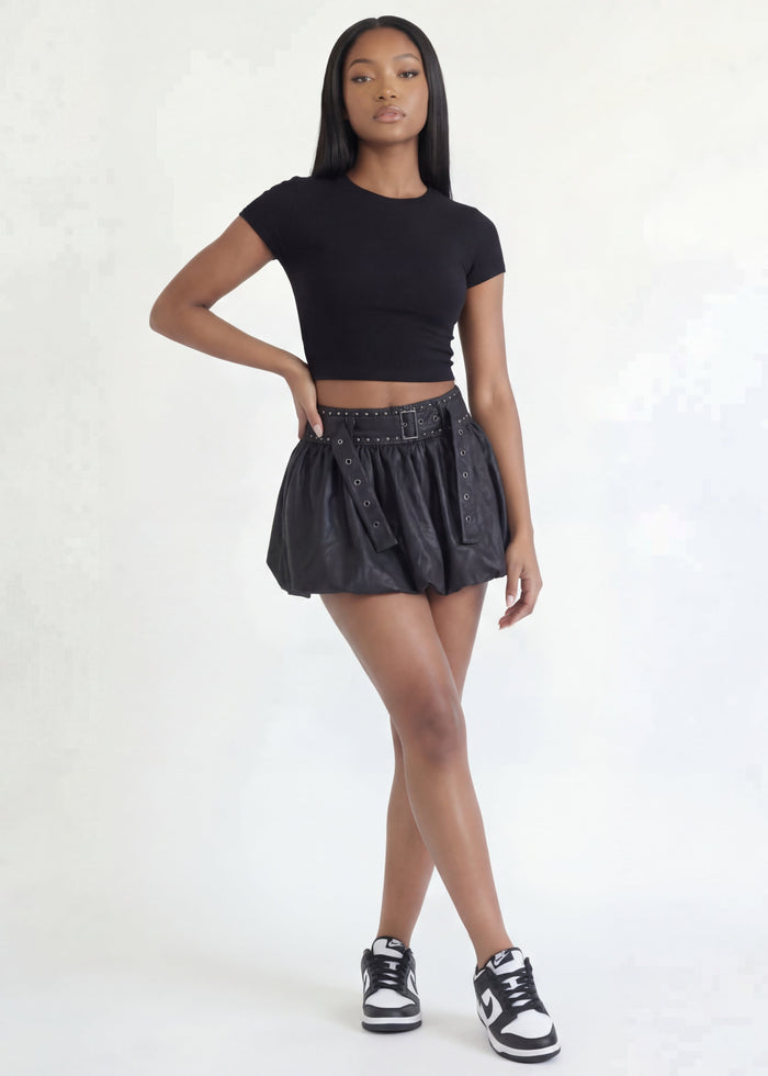 Embrace the balance of strength and softness with the Steelheart Black Leather Bubble Skirt – a piece that embodies confidence, elegance, and power. Crafted from 100% vegan leather (polyurethane), this short skirt features a sculptural bubble construction that adds striking volume and dimension to your look. The sleek black finish delivers a polished, modern edge, making it a bold wardrobe statement for any occasion. Whether paired with a tube top or your favorite graphic tee, it moves with purpose and style. The Steelheart Black Bubble Skirt reminds you to wear your strength softly—and your power proudly.