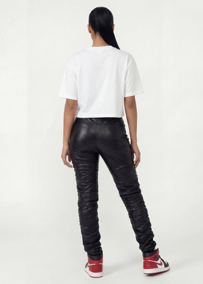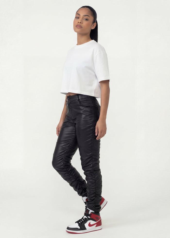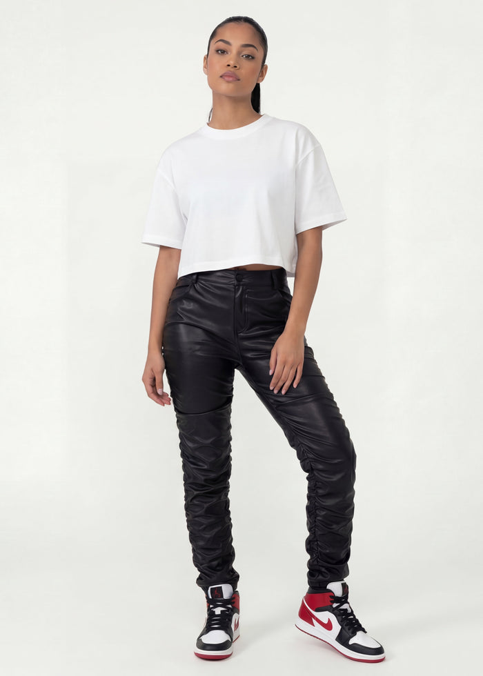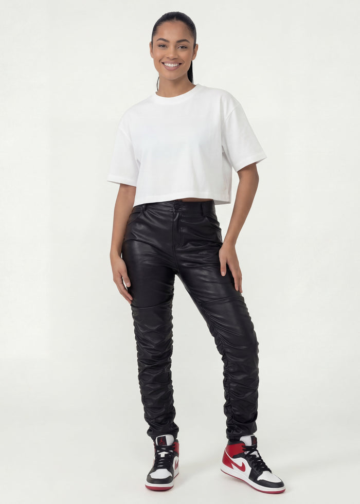 The Becoming Ruched PU Leather Pants are designed to match that energy. Crafted from thick, leather-look PU fabric, these high-rise pants sculpt and define your silhouette while the ruched detailing adds texture and dimension. The pull-on design keeps the fit sleek and smooth, giving you that effortless, put-together edge.