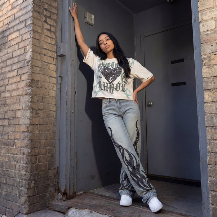 Your story. Your script. The Sacred Script Boxy Crop Tee transforms your belief into fashion that feels authentic and powerful. The women’s boxy fit french terry knit crop tee features an oversized silhouette that radiates comfort and confidence—a visual affirmation of self-worth. Pair it with the Sacred Script Denim Jeans: mid-rise, wide-leg denim crafted from a 98% cotton and 2% spandex blend, the set combines structure and stretch for a flawless fit. Patched accents add depth and texture, giving the jeans a modern, worn‑in charm with fashion‑forward attitude. (Jeans not included). Together, they create a look that is effortlessly expressive—soft, fearless, and unapologetically you.
